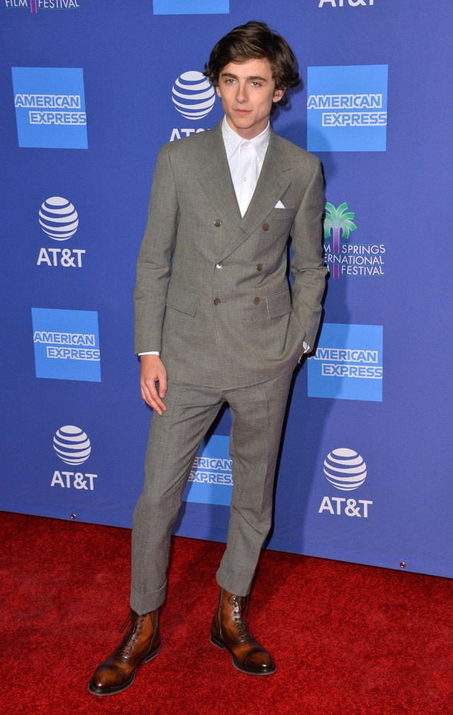 GhimTimothee Chalamet bước lên thảm đỏ trong bộ vest hai hàng khuy với áo sơ mi không cài cúc hoàn toàn.