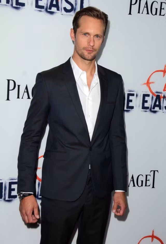 Alexander Skarsgård cởi nút trên cùng của áo sơ mi khi không đeo cà vạt trong bộ vest.
