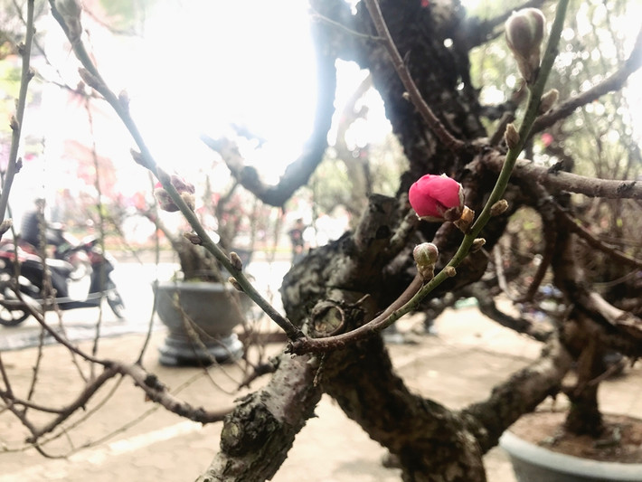 Gốc đào cổ có hai nhánh, già cỗi với những vết mục. Mới nhìn, tưởng rằng gốc cây đã bị chết, nhưng ở phía trên hoa đào đang đua nhau bung nở đỏ rực.