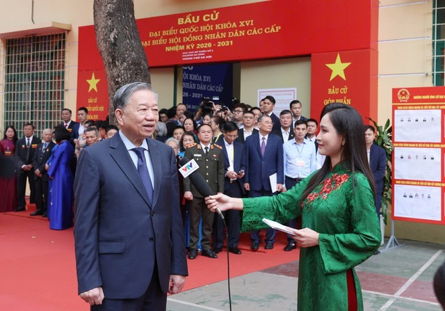 Tổng Bí thư Tô Lâm trả lời phỏng vấn sau khi bỏ phiếu bầu đại biểu Quốc hội khóa XVI và đại biểu HĐND các cấp nhiệm kỳ 2026 - 2031, sáng 15/3. Ảnh: QUANG PHÚC