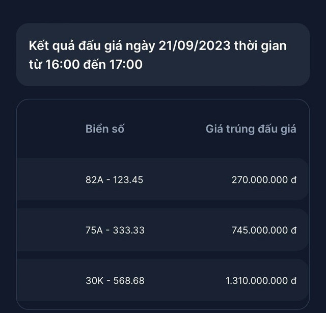Kết thúc phiên đấu giá buổi chiều, biển số 82A - 123.45 trúng đấu giá 270 triệu đồng, biển số Thừa Thiên Huế 75A - 333.33 trúng đấu giá 745 triệu đồng và biển số Hà Nội 30K - 578.68 trúng đấu giá hơn 1,3 tỷ đồng.