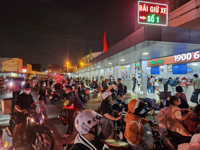 Từ chiều đến đêm 29/4, bến xe Miền Tây (quận Bình Tân, TP.HCM) đông nghẹt người đến mua vé xe khách để về quê nghỉ lễ. Tại các khu vực quầy vé, hành khách chen chúc nhau.