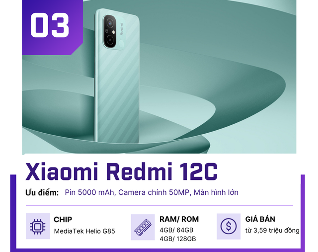 Trong danh sách này, Xiaomi Redmi 12C có giá bán thấp nhất. Sản phẩm là lựa chọn hợp lý cho người dùng phổ thông, không cần nhiều dung lượng bộ nhớ và không có nhu cầu chơi game nặng. Đồng thời, màn hình của máy chỉ có vết cắt "giọt nước" cũ kỹ.