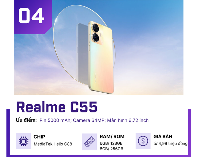 Đồng thời, chip xử lý khoẻ, bộ nhớ trong rộng rãi và màn hình cỡ lớn - 6,72 inch của máy đảm bảo mang lại trải nghiệm cực thích khi xem phim, chơi game. Về khả năng nhiếp ảnh, Realme C55 cũng không khiến người dùng thất vọng với camera chính 64MP, camera phụ 2MP - cho hình ảnh sắc nét và sống động.