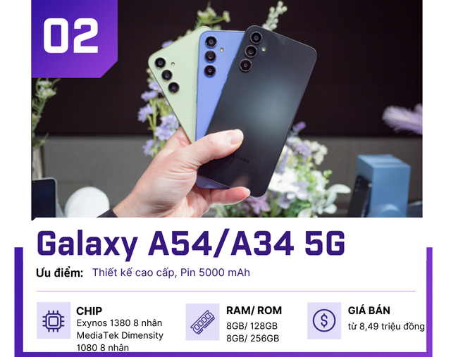 Tuy nhiên, Galaxy A54 5G có camera chính 50MP xịn hơn, chip mạnh hơn, màn hình "đục lỗ" tinh tế hơn. Ngược lại, Galaxy A34 5G lại sở hữu màn hình 6,6 inch lớn hơn, hiệu năng cũng mạnh mẽ không kém (Galaxy A54 5G chỉ có màn hình 6,4 inch nhỏ hơn).