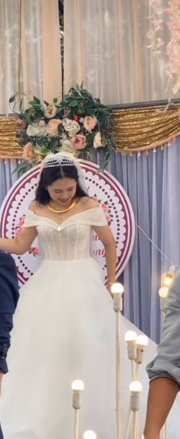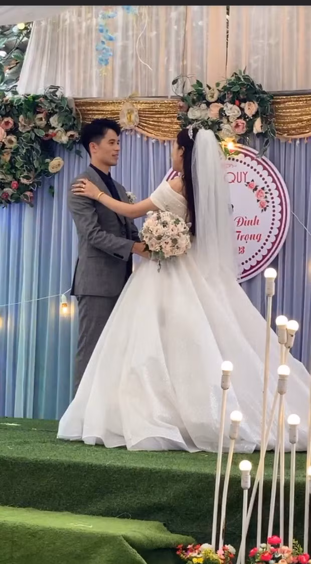 Cô dâu Huyền Trang sau khi diện trang phục truyền thống để làm lễ gia tiên đã chuyển sang mặc váy cưới hiện đại. Bạn bè quay lại hình ảnh cô dâu chú rể đeo của hồi môn gồm vòng kiềng và nhẫn vàng. Đình Trọng trao nụ hôn ngọt ngào cho bà xã trên sân khấu đám cưới.