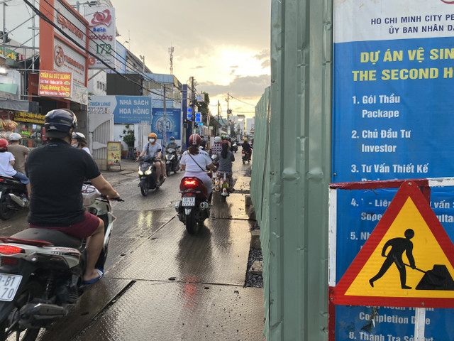 Đây là lô cốt của dự án vệ sinh môi trường TP.HCM giai đoạn 2. “Ngày nào cũng kẹt xe khi đi qua đây hết, có hôm trời mưa vào giờ cao điểm coi như tê liệt. Lô cốt chiếm trọn một phần mặt đường và ngay con hẻm nên người dân ra vào rất khó khăn”, bà Nguyễn Thị Hằng (người dân) than thở.