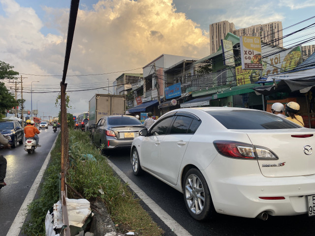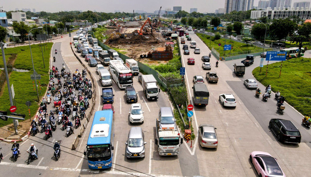 Hàng nghìn ô tô và xe máy nối đuôi nhau nhích từng chút qua nút giao An Phú, do bị lô cốt chiếm dụng phần lớn mặt đường.