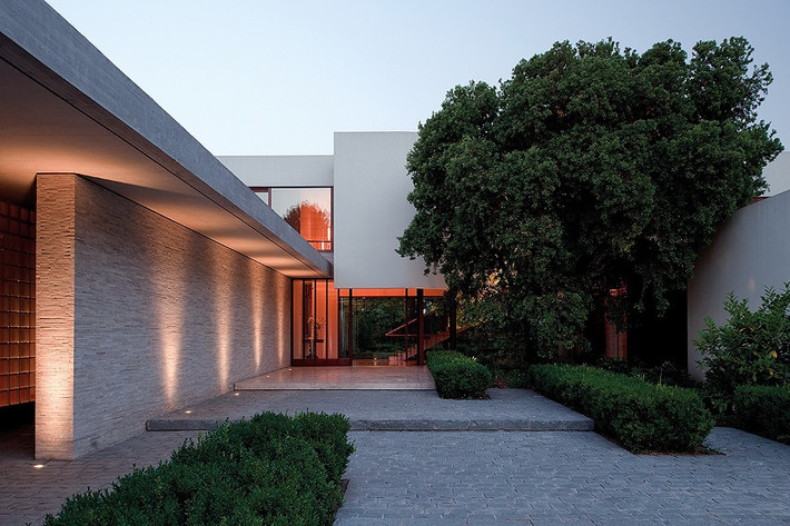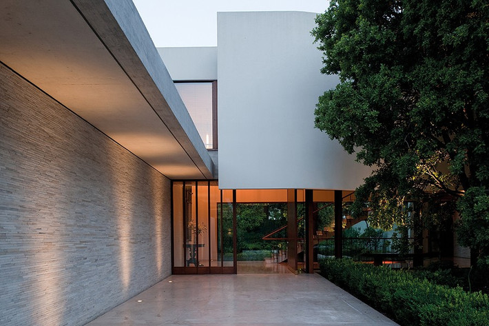 Ngôi nhà có một sân rộng lớn được thiết kế như bãi đỗ xe khách, tạo ra một lối vào dài dẫn đến cổng chính tăng cảm giác cởi mở cho căn nhà.