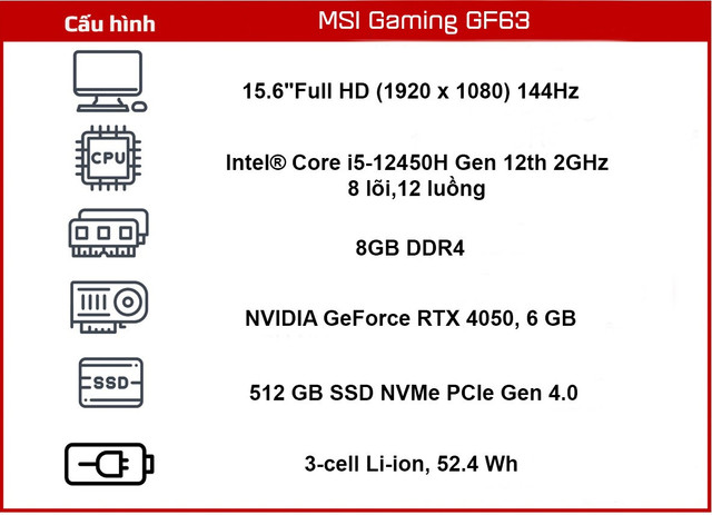 MSI Gaming GF63 được trang bị chip Intel Core i5 12450H, 8GB RAM DDR4 và đặc biệt là card đồ họa RTX 3050 4GB. Game thủ có thể nâng cấp máy lên 64GB RAM và bổ sung thêm dung lượng lưu trữ thông qua khe SATA 2.5inch có sẵn để cài đặt thêm nhiều ứng dụng và game nặng. Đồng thời máy cũng sở hữu nhiều cổng giao tiếp thông dụng như USB Type-C, USB 3.2, HDMI, LAN (RJ45) và jack 3.5mm.
