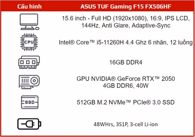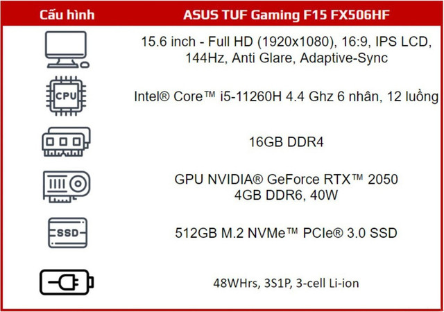 TUF Gaming A15 là mẫu laptop trang bị chip Core i5-11260H xung nhịp tới 4.4Ghz cùng card đồ họa NVIDIA GeForce RTX 2050. Đây là một cấu hình mạnh đáp ứng tốt các nhu cầu sử dụng từ chơi game đến làm việc. Máy được trang bị sẵn 8GB RAM DDR5 và còn trống một khe để bạn nâng cấp lên tối đa 32GB, thoải mái chạy đa nhiệm, chơi game, làm việc, nghe nhạc,…