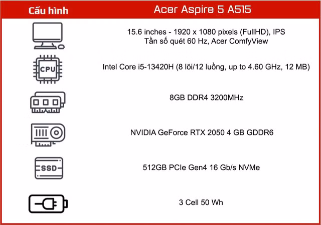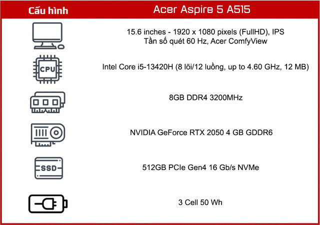 Aspire 5 A515 là dòng laptop phục vụ đủ mọi nhu cầu học tập, làm việc đến từ Acer. Máy trang bị bộ vi xử lý Intel Core i5-13420H 8 nhân và 12 luồng mạnh mẽ, 8GB RAM cùng card đồ họa RTX 2050 giúp giải quyết các tác vụ đồ họa, dù là công việc hay chơi game.