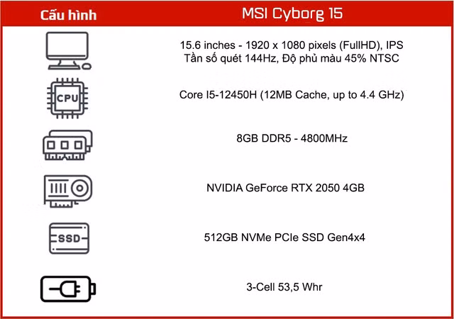 Máy được trang bị bộ vi xử lý Intel thế hệ thứ 12 i5-12450H và card đồ họa RTX 2050 4GB từ NVIDIA, cộng thêm 8GB RAM DDR5 có sẵn và ổ cứng SSD 512GB chuẩn NVMe. Nhờ cấu hình mạnh mẽ này nên MSI Cyborg 15 đảm bảo khả năng xử lý đỉnh cao cho mọi yêu cầu của người dùng.