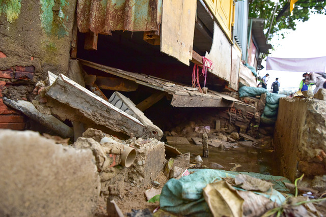 Nhiều căn khác phần móng bị sụp, ăn sâu vào trong trên 1m, nguy cơ đổ sập luôn chực chờ.