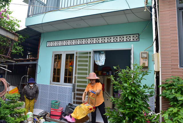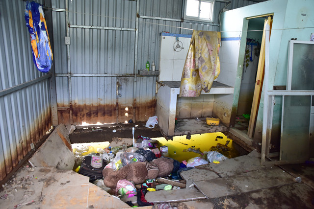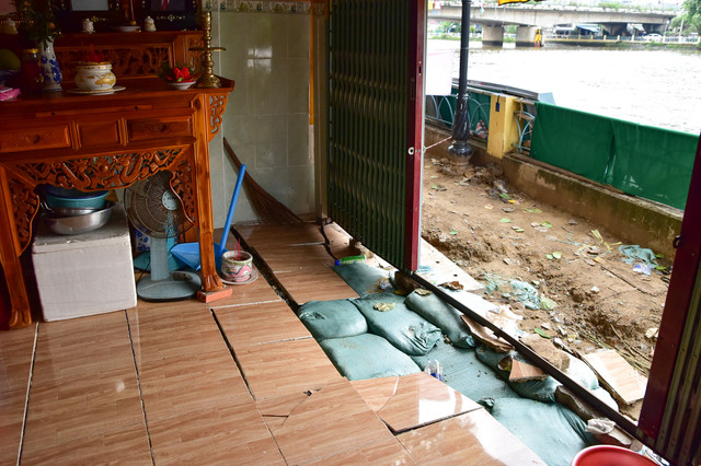 Một mảng nền nhà rộng gần 2m vuông của căn nhà bị biến mất, triều cường dâng gây ngập sau khi bị sụt lún khiến hộ dân này phải dời đi khẩn cấp.