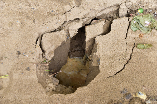 Thời điểm triều cường lên, nước xâm nhập vào hành lang kè khiến những mảng cát, đất bị sụp xuống thành hố, những mảng bê tông nứt toác.