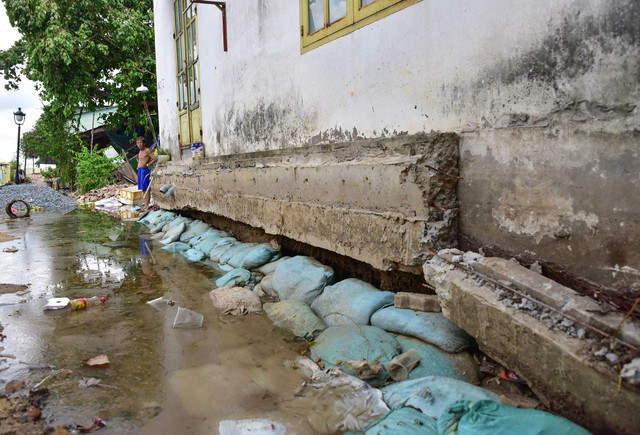 Chủ nhà phải gia cố móng bằng hàng chục bao cát để hạn chế sóng nước đánh xói lở.