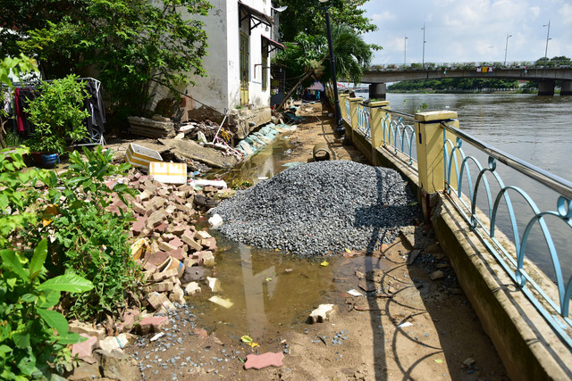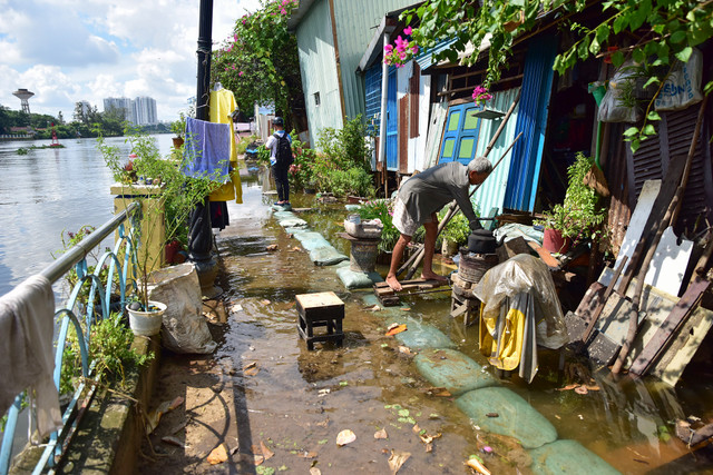 Triều cường gây ngập, kết hợp sóng nước mạnh từ các phương tiện đường thuỷ di chuyển qua khiến khu vực sạt lở thêm nguy hiểm hơn.