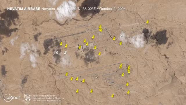 Theo báo Mỹ NPR, sử dụng hình ảnh vệ tinh thương mại, các chuyên gia kết luận rằng một căn cứ không quân ở miền nam Israel trúng 32 tên lửa đạn đạo Iran.