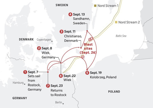 Các nhà điều tra Đức sau đó lần ra số điện thoại liên lạc của nhóm phá hoại. Dữ liệu tổng hợp cho phép phác họa toàn bộ hành trình của con thuyền vào thời điểm đánh bom đường ống Nord Stream.