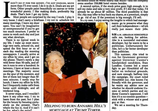 Xem bản tin về bà Hill trên NBC Nightly News, ông Trump viết trong cuốn The Art of the Deal (tạm dịch: Nghệ thuật đàm phán): "Tôi thấy một câu chuyện rất buồn. Những người làm việc chăm chỉ cả đời lại mất tất cả. Điều đó thật không hay chút nào".