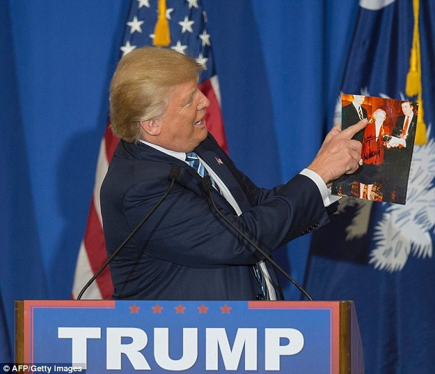 Trong cuộc vận động tranh cử năm 2016, ông Trump giơ bức ảnh chụp cùng chủ trang trại. Ảnh: Getty
