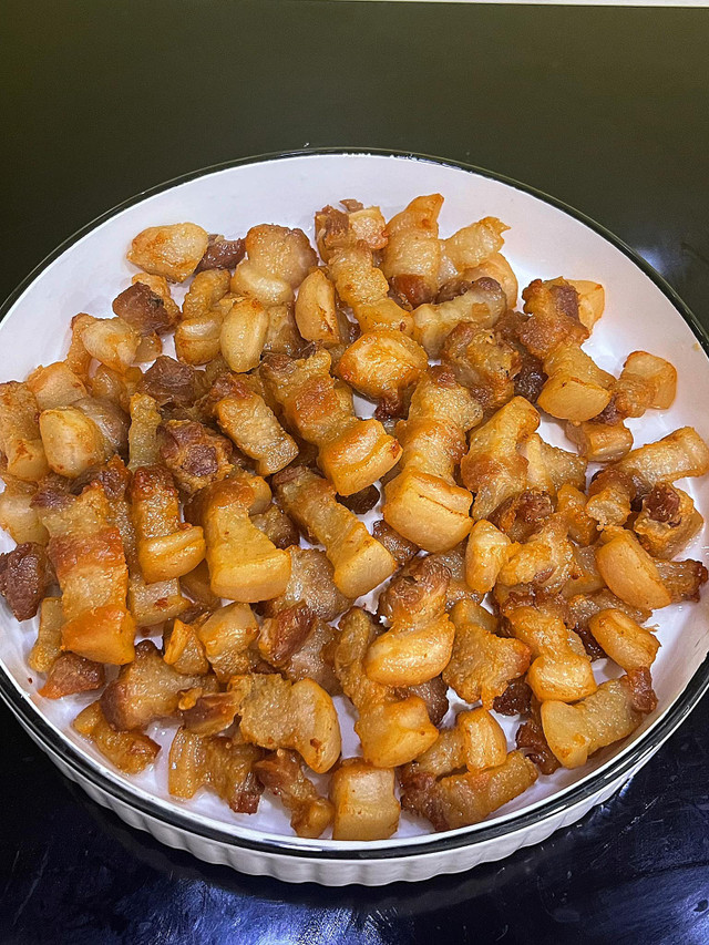 Thịt ba chỉ thái con chì rồi đem quay cho ra bớt mỡ đến khi cháy cạnh.