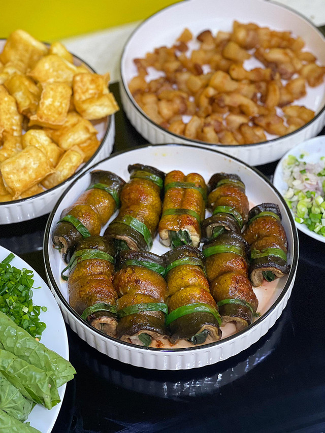 Thịt xay ướp cùng hạt tiêu, hạt nêm, hành củ và đầu hành lá thái nhỏ. Chuối xanh tước vỏ, cắt khúc 3-4cm rồi ngâm cùng nước mẻ cho hết thâm, rửa sạch lại với nước rồi ướp cùng 1 thìa bột nghệ và bát mẻ. Đậu phụ rán vàng.