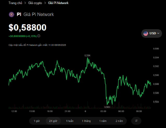 Mặc dù đón những thông tin tích cực, giá Pi vẫn chưa có sự bứt phá. Đến ngày 7/5, giá Pi trên sàn giao dịch OKX ở mức 0,58 USD. Trước đó, trưa ngày 4/5, giá Pi bật lên hơn 0,6 USD, sau đó nhanh chóng về lại ngưỡng 0,58-0,59 USD.