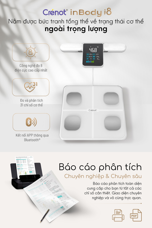 Đây là dòng cân cao cấp nhất của cả Crenot và thị trường cân điện tử sức khoẻ, được ví như "trợ lý sức khỏe tại nhà" nhờ khả năng đo toàn bộ cơ thể với 8 điểm chạm, thay vì chỉ đo nửa thân dưới như các dòng cân 4 điểm chạm thông thường. Crenot inBody i8 phân tích chi tiết tới 31 chỉ số, bao gồm các thành phần cơ thể từng vùng (tay, chân, bụng), cung cấp báo cáo phân tích chuẩn phòng gym, giúp người dùng có cái nhìn toàn diện nhất về sức khỏe của mình.