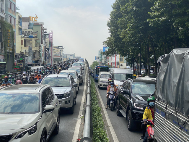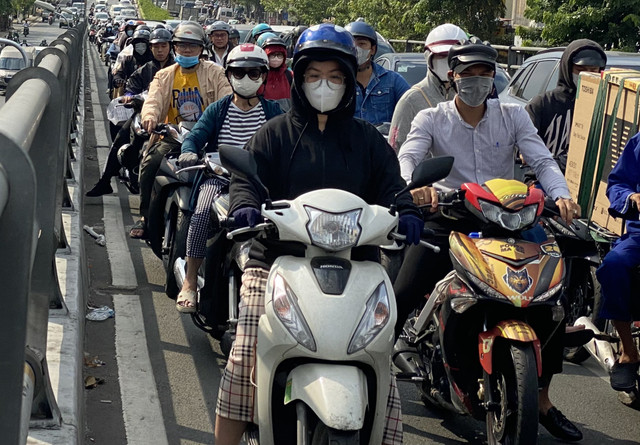 Dù CSGT tăng cường điều tiết, nhưng do phương tiện đổ ra đường quá nhiều nên kẹt xe càng nghiêm trọng, đặc biệt tại khu vực cầu vượt.
