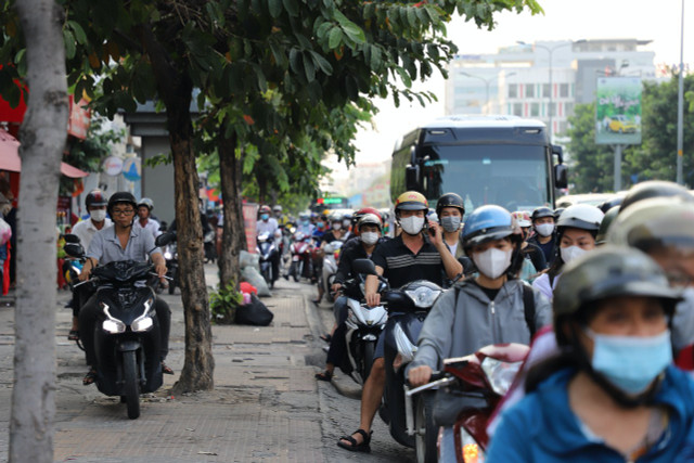 Nhiều xe máy phải đi trên vỉa hè để tìm cách thoát khỏi tình trạng ùn tắc kéo dài trên đường Cộng Hoà