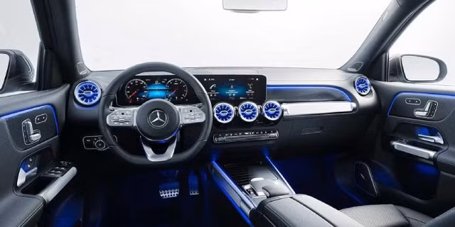 Nội thất GLB 200 AMG sang trọng, với ghế bọc da Artico, khoang lái thể thao và vô-lăng AMG. Hệ thống MBUX, màn hình 10.25 inch, hỗ trợ Apple CarPlay, Android Auto, và điều khiển giọng nói LINGUATRONIC. Tiện ích như đèn viền nội thất 64 màu, điều hòa 2 vùng và khởi động Keyless Start.