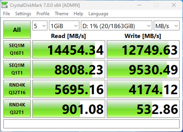 Tốc độ đọc, ghi thực tế của SSD Aorus Gen5 14000, đo bằng CrystalDiskMark 7.0.