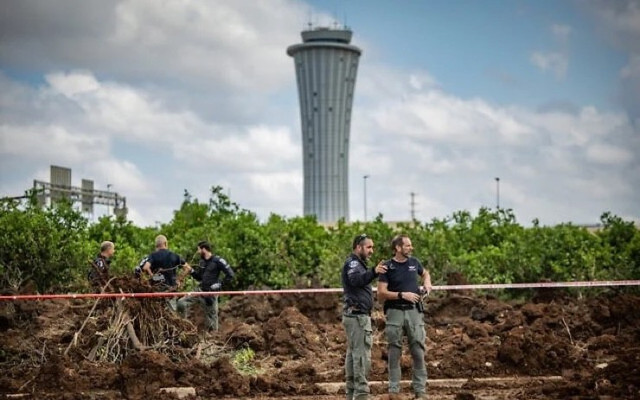 Lực lượng an ninh Israel phong tỏa hiện trường nơi tên lửa Houthi rơi ở khu vực sân bay. Ảnh: Flash90.