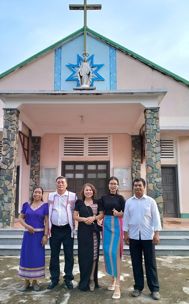 Siu Black chia sẻ niềm vui trong ngày đặc biệt bằng bức hình mặc trang phục truyền thống của người Ba Na và chụp ảnh bên ông xã trước nhà thờ Kon Rơbang.