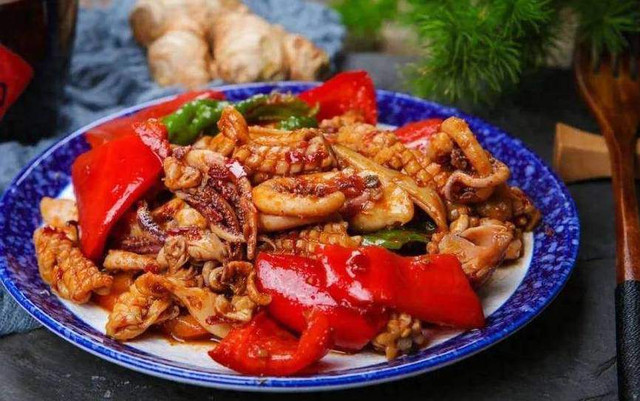 Nguyên liệu: bạch tuộc, hành tây, ớt chuông, gừng, tỏi băm, dầu ăn, nước tương đen, nước tương nhạt, đường, muối, cốt gà.