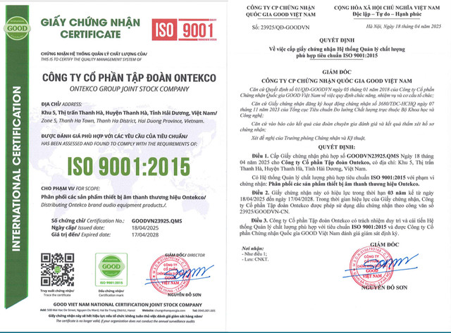 Ngày 18/04/2025, Công ty Cổ phần Tập đoàn ONTEKCO chính thức được tổ chức chứng nhận quốc tế GOOD VIET NAM cấp giấy chứng nhận ISO 9001:2015 – tiêu chuẩn quốc tế về hệ thống quản lý chất lượng. Phạm vi chứng nhận áp dụng cho hoạt động phân phối các sản phẩm thiết bị âm thanh mang thương hiệu ONTEKCO.