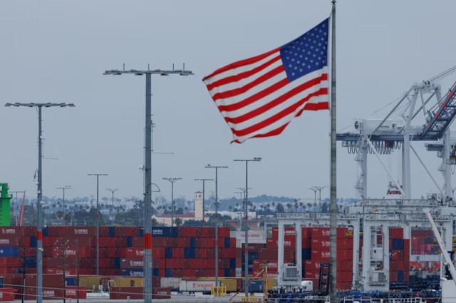 Cờ Mỹ tung bay gần các container Trung Quốc tại cảng Los Angeles.. Ảnh: Reuters