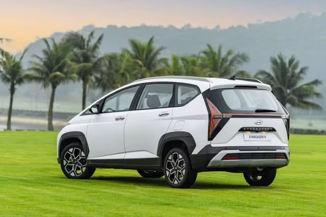 Tới phần thiết kế đuôi xe, mỗi xe MPV đều thể hiện một cá tính riêng. Stargazer X gây ấn tượng với cụm đèn hậu hình tam giác kết hợp đèn LED nối liền tạo thành chữ H, biểu tượng Hyundai cách điệu, giúp tăng độ nhận diện từ phía sau. Ngoài ra còn có đèn phanh LED trên cao và thiết kế kính hậu liền khối với đèn, tạo cảm giác liền mạch.