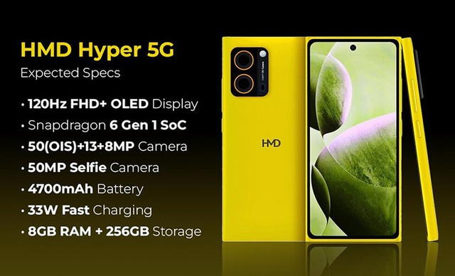Bên cạnh đó, HMD Hyper được cho là có RAM 8 GB và bộ nhớ trong 256 GB (có thể mở rộng qua khe cắm thẻ nhớ microSD), cũng như pin lớn 4.700 mAh hỗ trợ sạc có dây 33W. HMD Hyper đi kèm với thiết lập ba camera ở mặt sau, gồm cảm biến 50 MP, 13 MP và 8 MP. Ngoài ra còn có một camera selfie 50 MP ở mặt trước đặt trong phần đục lỗ.