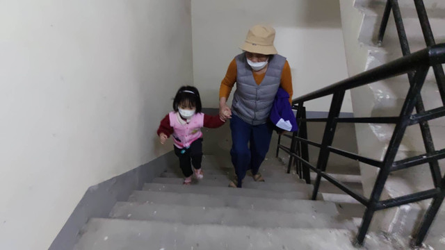 Hai bà cháu đi bộ từ tầng 31 xuống tầng 14 lại quay về.