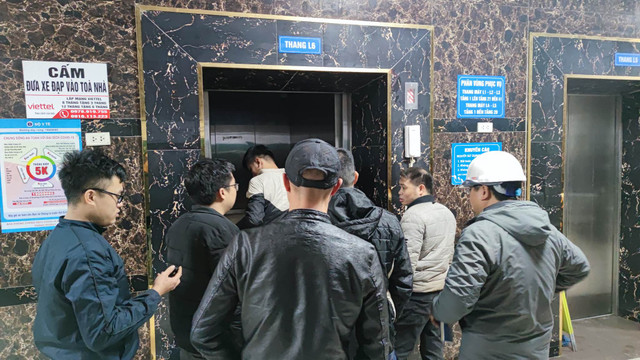 Lực lượng chức năng đang sửa chữa các thang máy tại toà HH3C sau vụ cháy.