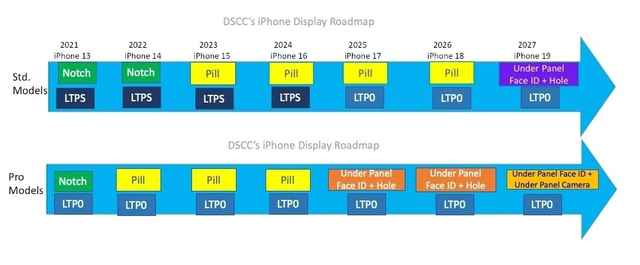 Cũng theo Ross Young, nếu mọi việc diễn ra theo đúng kế hoạch, dòng iPhone 2027 của Apple - iPhone XX sẽ có thiết kế toàn màn hình 100%, không có bất kỳ lỗ khoét nào (Face ID và camera selfie đều nằm dưới màn hình).