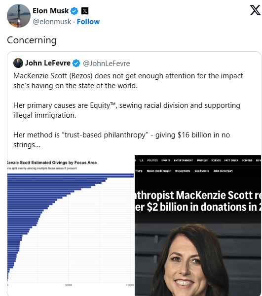 Elon Musk đã nhiều lần công khai chỉ trích Scott vì các khoản đóng góp tập trung vào các mục tiêu mà ông cho là "thiên về tự do". Gần đây, ông chia sẻ một bài đăng trên mạng xã hội X (trước đây là Twitter) của tác giả John LeFevre, bày tỏ lo ngại về việc Scott tài trợ cho các tổ chức phi lợi nhuận liên quan đến công bằng xã hội và bảo vệ quyền lợi.