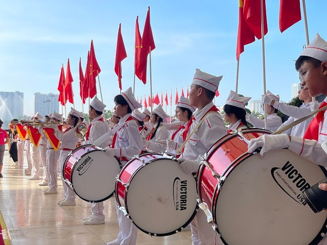 Tại Trường Tiểu học Kim Đồng, hơn 1.800 học sinh trong những bộ quần áo mới, hân hoan dự lễ khai giảng năm học 2025 - 2026.