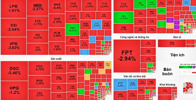Áp lực bán mạnh trên diện rộng vẫn khiến thị trường chìm trong sắc đỏ và VN-Index duy trì đà giảm sâu dù lực cầu tham gia khá tích cực. Sức bán lớn khiến hầu hết các nhóm ngành cổ phiếu giảm điểm. Trong đó bảo hiểm; chứng khoán; công nghệ và thông tin; bán lẻ; sản xuất hàng gia dụng; sản xuất nhựa-hóa chất; chế biến thủy sản; vật liệu xây dựng; sản xuất phụ trợ đều giảm mạnh.