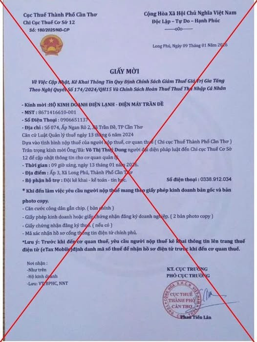 Thuế TP Cần Thơ khẳng định không yêu cầu người nộp thuế nộp tiền, cung cấp thông tin cá nhân, tài khoản ngân hàng qua điện thoại, mạng xã hội; không sử dụng giấy mời không đúng thể thức, sai tên đơn vị, sai địa chỉ, số hiệu văn bản hoặc dấu, chữ ký không hợp lệ.