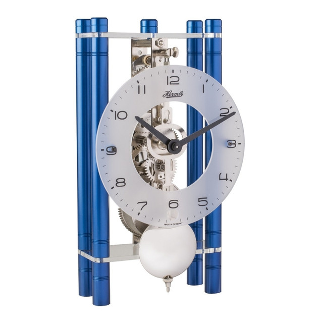 Hermle 23021-Q70721 là mẫu đồng hồ để bàn hiện đại từ nhà chế tác Hermle. Máy đồng hồ và quả lắc được làm bằng đồng thau mạ niken sáng bóng. Điểm nhấn của sản phẩm chính là các trụ được làm bằng nhôm mạ màu xanh lam chống oxy hóa.