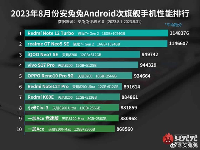 AnTuTu vừa tiết lộ những smartphone Android tầm trung có hiệu năng tốt nhất tính đến tháng 8/2023. Danh sách này bao gồm 10 mẫu smartphone tầm trung tốt nhất xét về giá trị và hiệu năng.